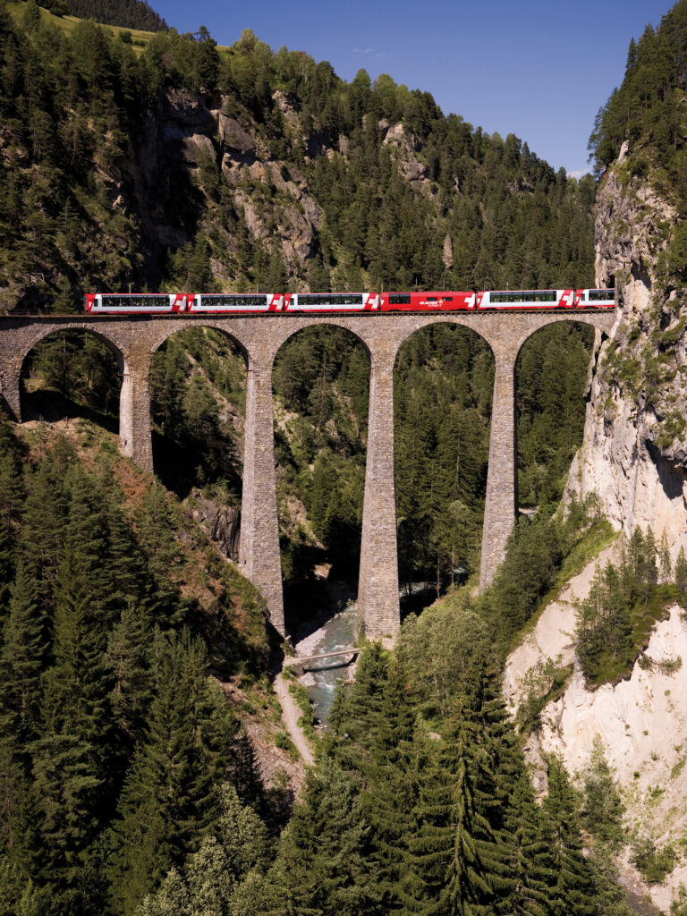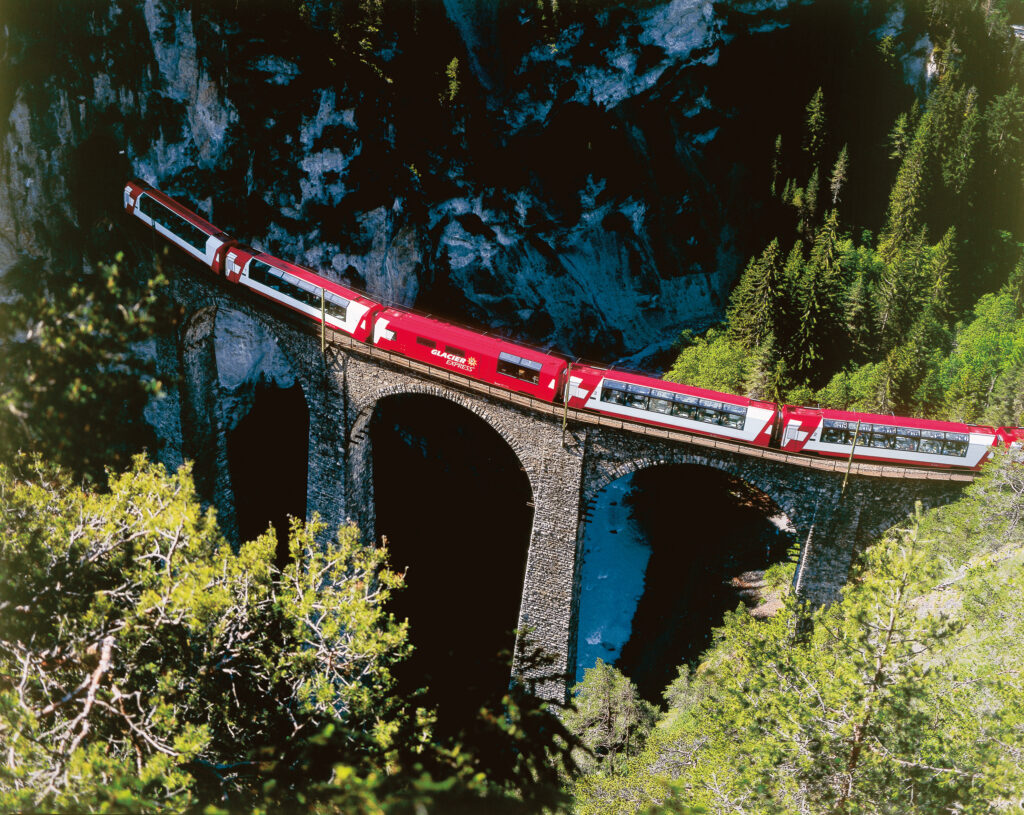 Am heutigen Tag erwartet Sie ein besonderer Höhepunkt Ihrer Reise. Nachdem Sie gemütlich gefrühstückt haben, begeben Sie sich zum Bahnhof Zermatt, wo Sie Bekanntschaft mit dem legendären Glacier Express machen. Die traditionsreiche Bahnverbindung zwischen den Schweizer Kantonen Wallis und Graubünden besteht bereits seit 1930. Der «langsamste Schnellzug der Welt» ist eine Schmalspurbahn, die sich streckenweise mit Zahnradantrieb die Berge hinaufzieht. Freuen Sie auf die komplette klassische Strecke des Glacier Express von Zermatt nach St. Moritz – eine unvergessliche Fahrt durch die herrliche Landschaft mit zahlreichen Bergen, Tälern und Wiesen. In modernen Panoramawagen, die einzigartige Ausblicke auf die zauberhafte Landschaft freigeben, genießen Sie Natur pur. Während der rund achtstündigen Fahrt passieren Sie knapp 300 Brücken und 90 Tunnel. Sie überwinden den 2.033 Meter hohen Oberalppass und durchqueren die bis zu 400 Meter tiefe Rheinschlucht. Ab der Gemeinde Thusis fährt der Glacier Express auf der Albulastrecke, die im Juli 2008 zum Weltkulturerbe der UNESCO ernannt wurde. Bei Filisur erreichen Sie ein beeindruckendes Wahrzeichen der Bahnlinie. Das im Oktober 1902 fertiggestellte Landwasserviadukt wurde im Juli 1903 eröffnet. Die beeindruckende, 65 Meter hohe und 136 Meter lange Steinbogenbrücke überquert den Landwasser- Bach und mündet dann in den 216 Meter langen gleichnamigen Tunnel. Am Bahnhof von St. Moritz steigen Sie in den Bus um, der Sie zu Ihrem 3- bis 4-Sterne-Hotel im Engadin bringt. Das Abendessen nehmen Sie im Hotel ein.