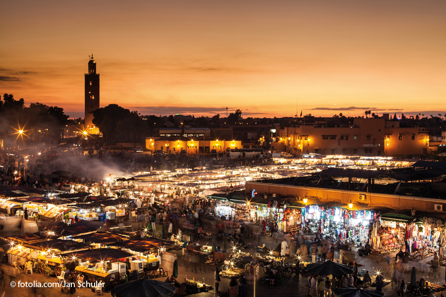 Insbesondere im nördlichen Afrika wird die Altstadt arabischer Städte als «Medina» bezeichnet. Marrakesch ist bekannt für seinen zauberhaften historischen Stadtkern. Nachdem Sie am gestrigen Tag bereits den Djemaa el Fna kennenlernen konnten, widmen Sie sich nach dem Frühstück weiteren Sehenswürdigkeiten der Medina, die 1985 zum UNESCO-Weltkulturerbe erklärt wurde. Freuen Sie sich auf den Besuch der Medersa Ben Youssef, die Ihnen einen faszinierenden Einblick in die islamische Baukunst bietet. Im 14. Jahrhundert gegründet, wurde das Gebäude ab 1570 unter der Dynastie der Saadier prachtvoll ausgebaut. Im Laufe der Jahre entwickelte sich die Medersa zur größten islamischen Hochschule der Maghreb-Staaten. Beim Rundgang durch die einstige Koranschule, die 1960 in ein Museum umgewandelt wurde, entdecken Sie herausragende Stuckund Schnitzarbeiten sowie wundervolle Mosaike. Im Anschluss tauchen Sie in das orientalische Leben in den bunten Gassen der Souks ein, die seit dem Mittelalter traditionell nach Zünften organisiert sind. Nach dem Mittagessen im Restaurant «Al Baraka» lassen Sie sich vom Anblick der Außenfassade der Koutoubia-Moschee verzaubern. Das Minarett der im zwölften Jahrhundert erbauten Moschee gilt als Wahrzeichen Marrakeschs und des ganzen Landes. Zum Abschluss besichtigen Sie die Saadier-Gräber – die bedeutendste Nekropole der Saadier, die von Mitte des 16. bis Mitte des 17. Jahrhunderts über das heutige Marokko herrschten – sowie den im 19. Jahrhundert errichteten Bahia-Palast. Am späten Abend kehren Sie zu Ihrem Hotel zurück.