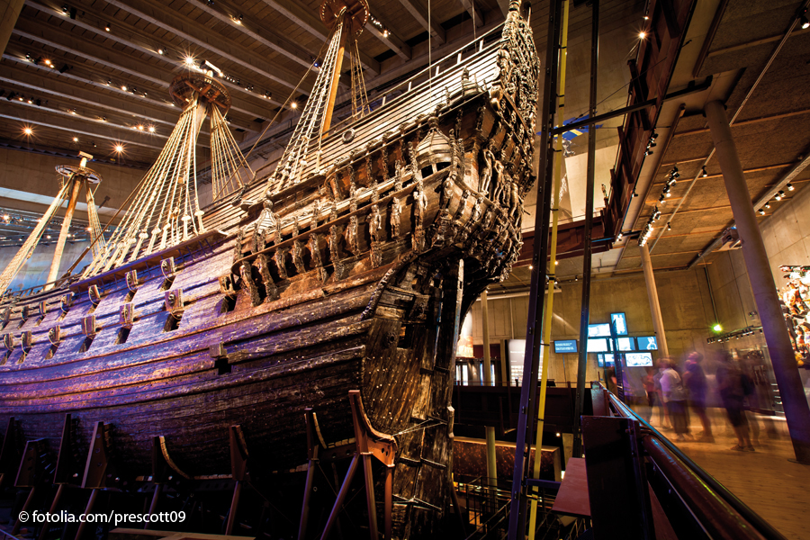 Am Vormittag erkunden Sie zunächst Stockholms sehenswerte Altstadt – schwedisch Gamla Stan – auf der Insel Stadsholmen bei einem Rundgang. Neben dem Schloss sehen Sie die Kirchen Storkyrkan und Tyska Kyrkan – die Domkirche und die Deutsche Kirche – sowie das Ritterhaus Riddarhuset. Freuen Sie sich im Anschluss auf die Besichtigung des im Jahr 1923 eingeweihten Rathauses auf der Insel Kungsholmen. Stockholms Stadshus besitzt verschiedene Repräsentationsräume wie den Goldenen Saal mit seinen in Gold gehaltenen Mosaiken, den Beratungssaal, in welchem die Stadtregierung zusammentritt, die Galerie des Prinzen sowie die Blaue Halle, wo jährlich das Festessen anlässlich der Nobelpreisvergabe stattfindet. Der 160 Meter hohe Stadthausturm, welcher den Ost- und Südflügel des Rathauses verbindet, ist inspiriert vom Turm der alten Burg Tre Kronor, «Drei Kronen» aus dem 13. Jahrhundert, die bei einem Brand 1697 nahezu vollständig zerstört wurde. Die Spitze des Stadthausturmes ist geziert von drei goldenen Kronen. Zur Mittagszeit begeben Sie sich erneut zum imposanten Königlichen Schloss, das von Ende des 17. bis Mitte des 18. Jahrhunderts an der Stelle errichtet wurde, an der sich einst die Burg Tre Kronor befand. Der vom Hofarchitekten Graf Nicodemus Tessin der Jüngere entworfene Bau gilt als architektonisches Meisterwerk. Vor dem Schloss verfolgen Sie die Wachablösung – ein besonderes Ereignis. Um 12.15 Uhr marschieren die neuen Wachtruppen, begleitet von Musikkorps in historischen Uniformen auf und zelebrieren die Wachablösung. Im Anschluss an die rund 45-minütige Zeremonie gestalten Sie den restlichen Tag nach eigenen Vorstellungen – Tipps erhalten Sie gerne von Ihrer Reiseleitung. Empfehlenswert ist beispielsweise der Besuch des Vasa-Museums auf der Insel Djurgården. Das maritime Museum beherbergt das nahezu vollständig erhaltene Kriegsschiff Vasa. Aufgrund ihrer konstruktiven Instabilität sank die Galeone 1628 auf ihrer nur rund zwanzig Minuten langen Jungfernfahrt im Hafen Stockholms. Nach der Wiederentdeckung 1958 und der Bergung 1961 kann das restaurierte Schiff im 1990 eröffneten Vasa-Museum besichtigt werden. In der Haupthalle werden neben der Vasa auch archäologische Funde von Schiffen sowie Gegenstände des frühen 17. Jahrhunderts ausgestellt.