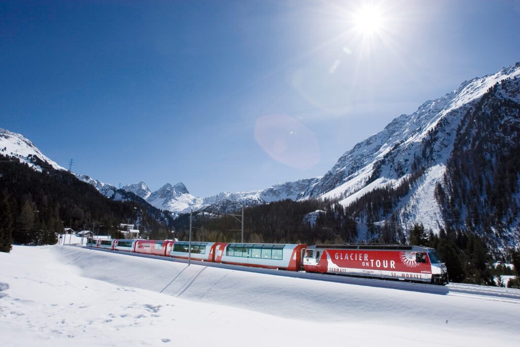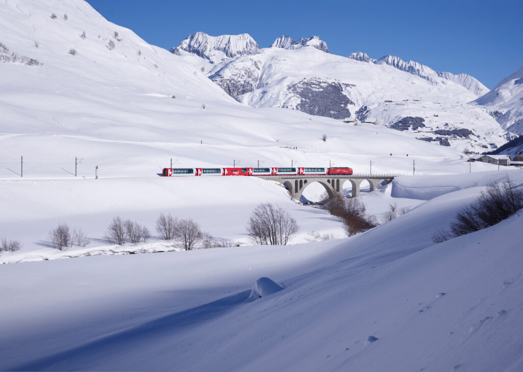 Die schönen STÄDTE der Schweiz und WINTERLICHER BAHNGENUSS – Fahrten mit dem GLACIER EXPRESS von Andermatt nach Chur sowie mit dem BERNINA EXPRESS von Chur nach Tirano.